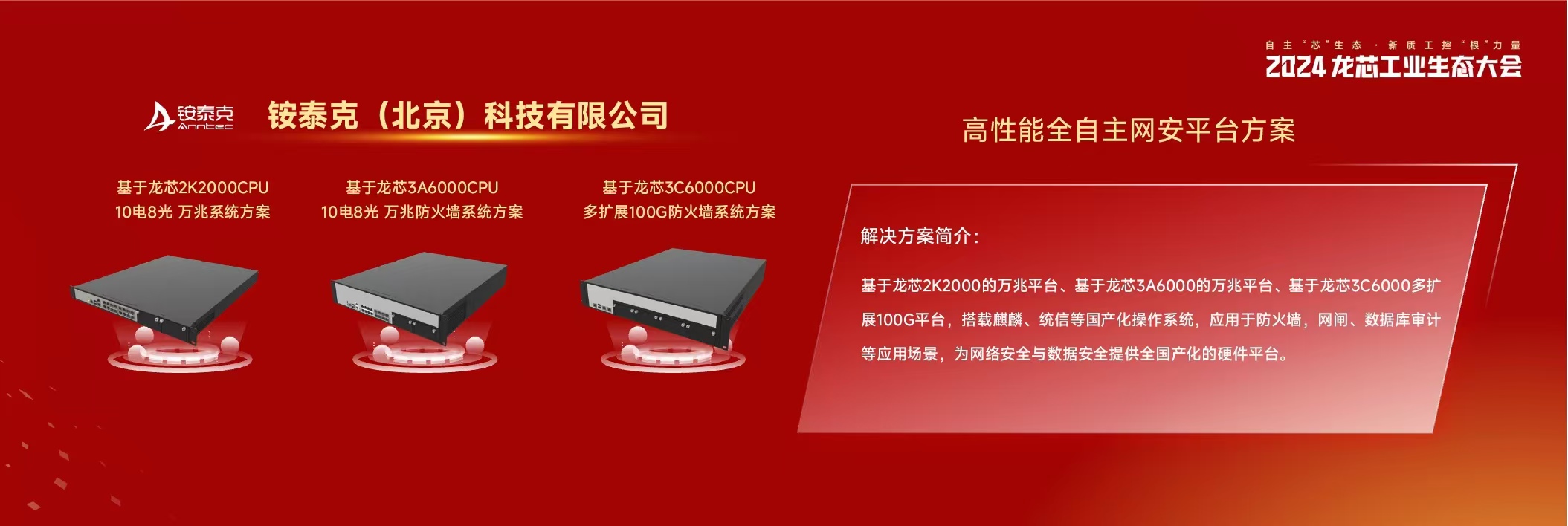 2024年10月15日,備受矚目的龍芯工業(yè)生態(tài)大會在南京揚子江國際會議中心隆重召開,此次大會不僅匯聚了眾多行業(yè)內(nèi)的精英和專家,更成為展示國產(chǎn)芯片技術(shù)和創(chuàng)新成果的重要舞臺。在這場盛會中,銨泰克(北京)科技有限公司憑借其最新的ANS-3C6000產(chǎn)品,成為全場矚目的焦點之一。銨泰克作為國家級高新技術(shù)企業(yè)和北京市“專精特新”企業(yè),一直致力于研發(fā)創(chuàng)新型的網(wǎng)絡(luò)安全硬件平臺。此次發(fā)布的ANS-3C6000,是一款基于龍芯LS3C6000 16核32線程LoongArch架構(gòu)處理器的高性能網(wǎng)絡(luò)安全產(chǎn)品。